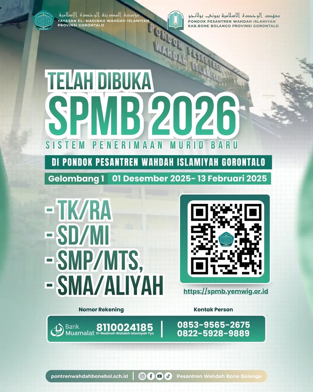 Gorontalo — Pondok Pesantren Wahdah Islamiyah Gorontalo kembali membuka Sistem Penerimaan Murid Baru (SPMB) Tahun 2026 untuk seluruh jenjang pendidikan: RA, MI, MTs, hingga MA, mulai 1 Desember 2025. Pendaftaran dikenakan biaya Rp 25.000, ditransfer melalui: